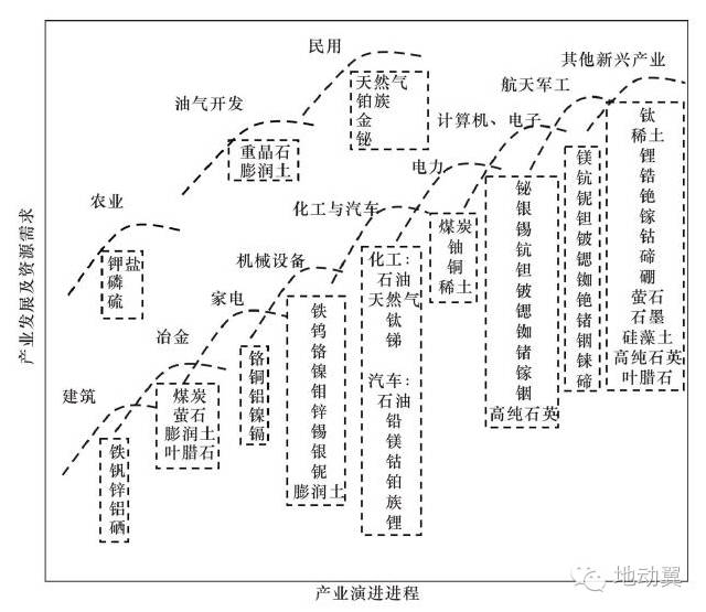 不同的产业消耗的主要矿产资源是不同的,随着产业的演进,资源产业也有一定的演进规律。中国地质科学院陈其慎等人通过对完整工业化过程的美国、日本进行了实证分析,证实了资源产业的雁行式演进规律。美国30种矿产有历史的消费数据,其中20种矿产40%以上的消费量集中在某一部门。日本25个矿种中,有22种矿产40%以上的消费量集中在某一部门。矿产资源消费历史与产业演进历史吻合。主导产业与矿产消费顶峰关系见图2。