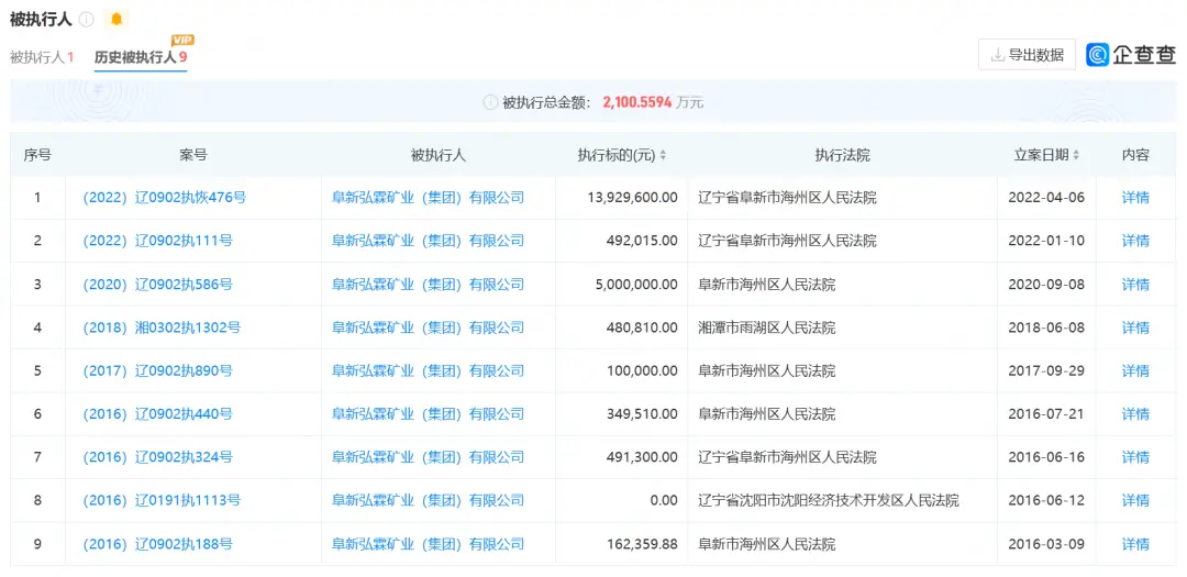 此外,企查查显示,2016年以来,阜新弘霖矿业公司成为历史被执行人9次,涉及金额2100多万元,还曾是失信被执行人。