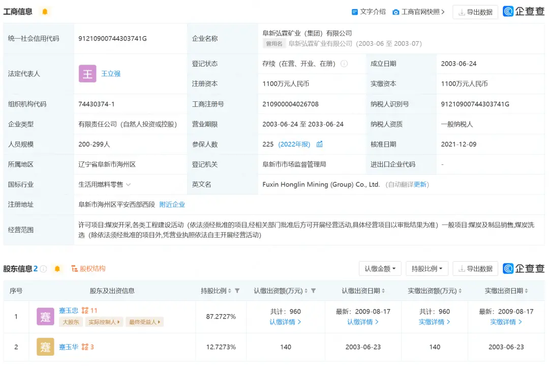 企查查APP显示,蹇玉忠和蹇玉华分别持有阜新弘霖矿业公司82.27%和12.73%的股权,王立强为法定代表人。蹇玉忠同时还是阜新弘霖煤炭销售有限公司、阜新德佳液压机械制造有限公司等企业的控股股东。