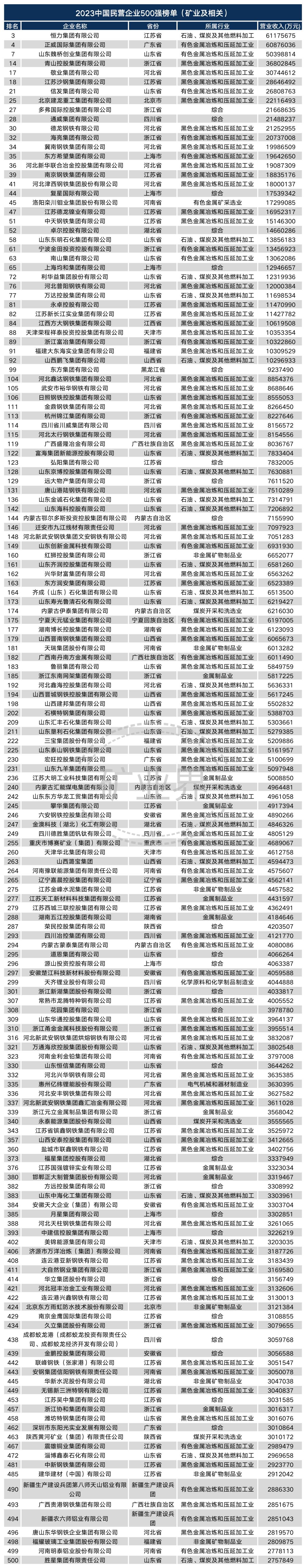 “2023中国民营企业500强”中的涉矿企业名单