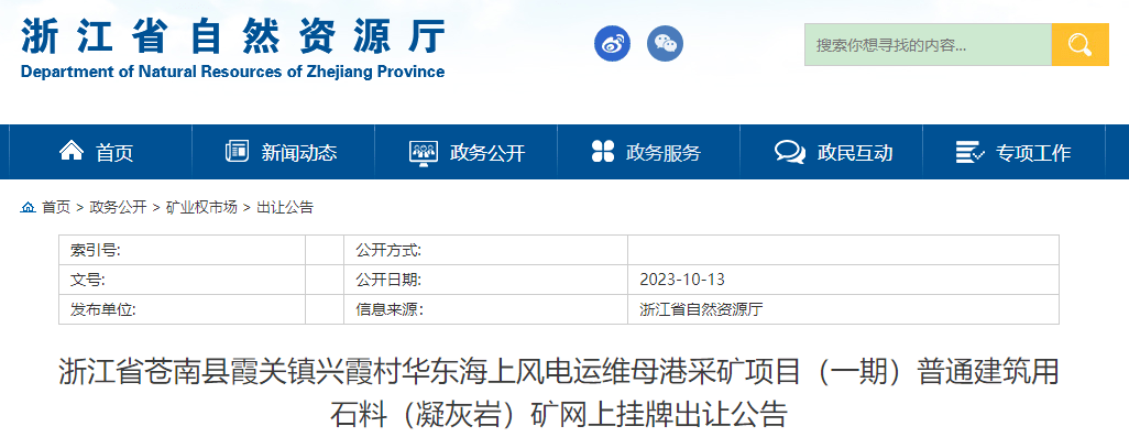根据《中华人民共和国矿产资源法》、《矿业权出让交易规则》(自然资规〔2023〕1号)、《浙江省自然资源厅关于贯彻落实自然资源部推进矿产资源管理改革若干事项意见(试行)的通知》(浙自然资规〔2020〕6号)、《浙江省矿业权网上拍卖挂牌交易规则(试行)》(浙自然资规〔2019〕5号)、《浙江省自然资源厅关于印发<浙江省矿业权人和地矿中介服务机构信用监督管理办法><浙江省地矿专家信用监督管理办法>的通知》(浙自然资规〔2020〕1号)等相关规定,现以网上挂牌方式公开出让浙江省苍南县霞关镇兴霞村华东海上风电运维母港采矿项目(一期)普通建筑用石料(凝灰岩)矿采矿权。现将有关事项公告如下: