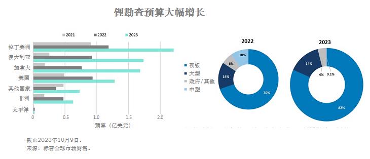 同2022年一样,今年锂勘查预算较上年增长近一倍。2023年,8.3亿美元用于新发现和增加锂资源量,为第三大勘查投资有色金属。