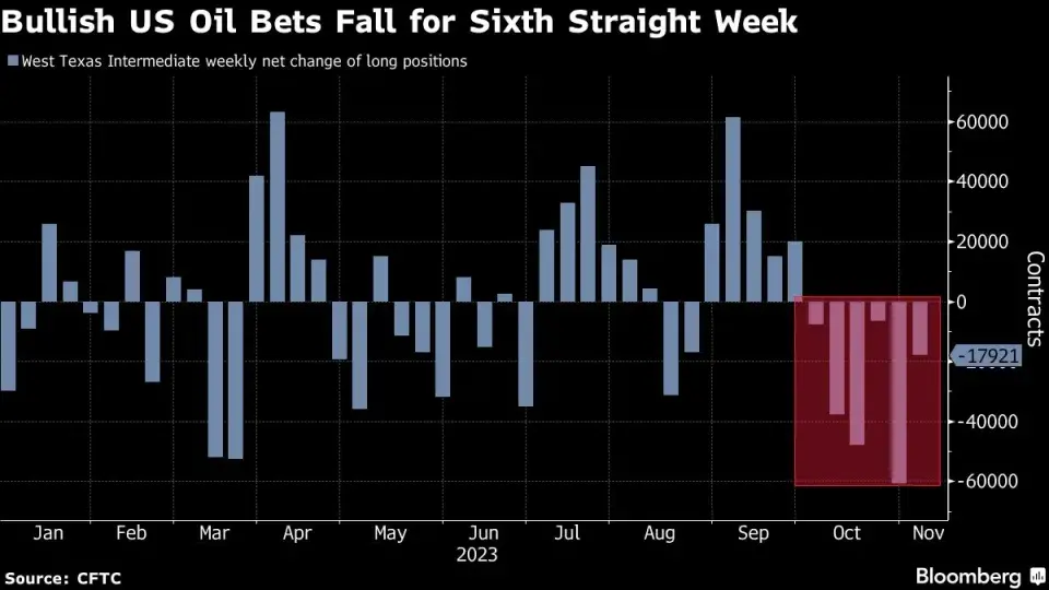 基金经理在过去一个月里将对美国原油的看跌押注增加了四倍以上。根据商品期货交易委员会(CFTC)的数据,截至11月7日的一周内,空头头寸增加了超过20000份合约,达到95756份,为7月以来的最高水平。与此同时,对冲基金连续第六周削减了多头头寸。