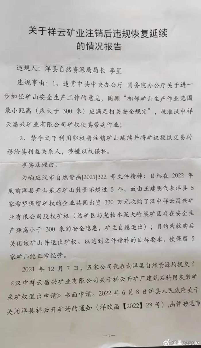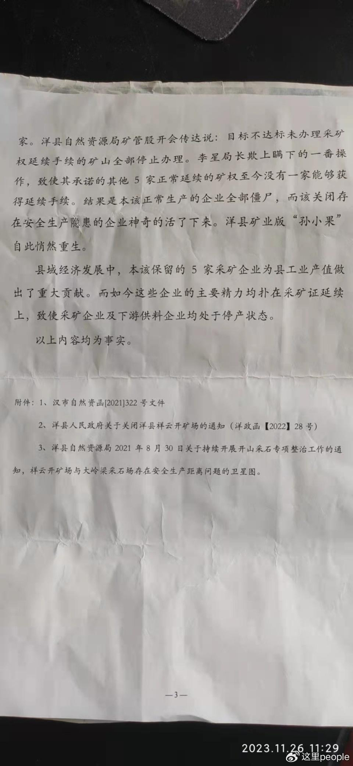 5名矿主不满意李局长的做法,今年7月7日,洋县人民政府下发文件批办单,建议洋县自然资源局执行“洋县县政府2022年28号关闭矿业企业函的文件精神(关闭祥云开矿场的通知)。从根本上解决洋县采矿企业相关问题。”