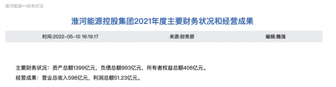 据其官网最新的财务信息显示,淮河能源控股集团2021年末资产总额1399亿元,负债总额993亿元,所有者权益总额406亿元,当年营业总收入596亿元,利润总额51.23亿元。