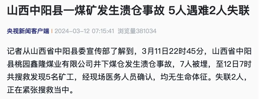 据央视新闻,记者从山西省中阳县委宣传部了解到,3月11日22时45分,山西省中阳县桃园鑫隆煤业有限公司井下煤仓发生溃仓事故,7人被埋,至12日7时共搜救发现5名矿工,经现场医务人员确认,均无生命体征。失联2人,正在紧张搜救当中。