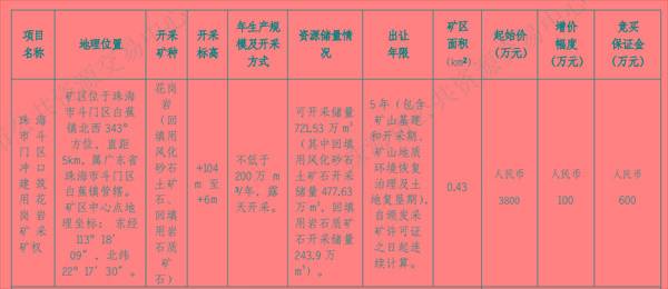 该矿可开采储量721.53万方(其中回填用风化砂石土矿石开采储量477.63万方,回填用岩石质矿石开采储量243.9万方);生产规模不低于200万方/年;采矿权出让年限为5年(包含矿山基建和开采期、矿山地质环境恢复治理及土地复垦期),挂牌起始3800万元,珠海闽航建筑工程有限公司以1.82亿元竞得。