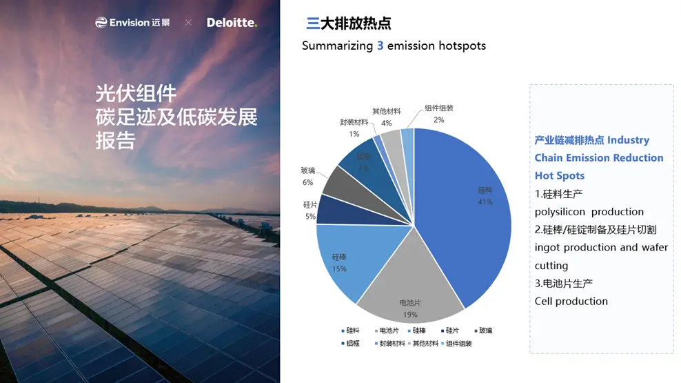 报告全流程追溯光伏组件全产业链碳足迹,发现光伏组件的碳排放热点主要在三大类——硅料生产、电池片生产和硅棒制备及切片,那也是整个光伏组件产业链比较高能耗的三个环节。