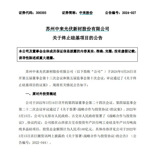 ?在官宣硅基项目两年后,4月24日晚间,光伏背板行业龙头企业中来股份忽然发布公告,宣布终止这项140亿元的大项目。