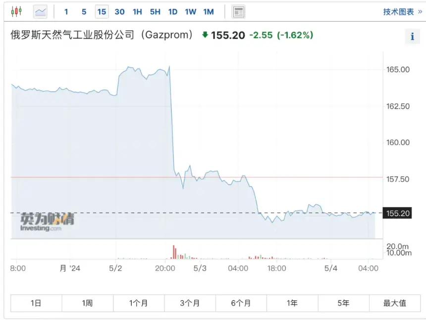 受业绩巨亏影响,俄气公司股价连续重挫,当地时间5月2日、3日,跌幅分别达3.35%、1.62%。