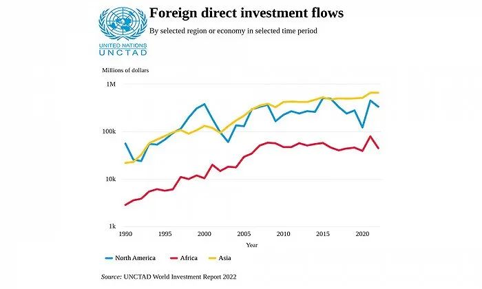 1990-2022年北美(蓝色)、非洲(红色)和亚洲(黄色)的全球外国直接投资流量。