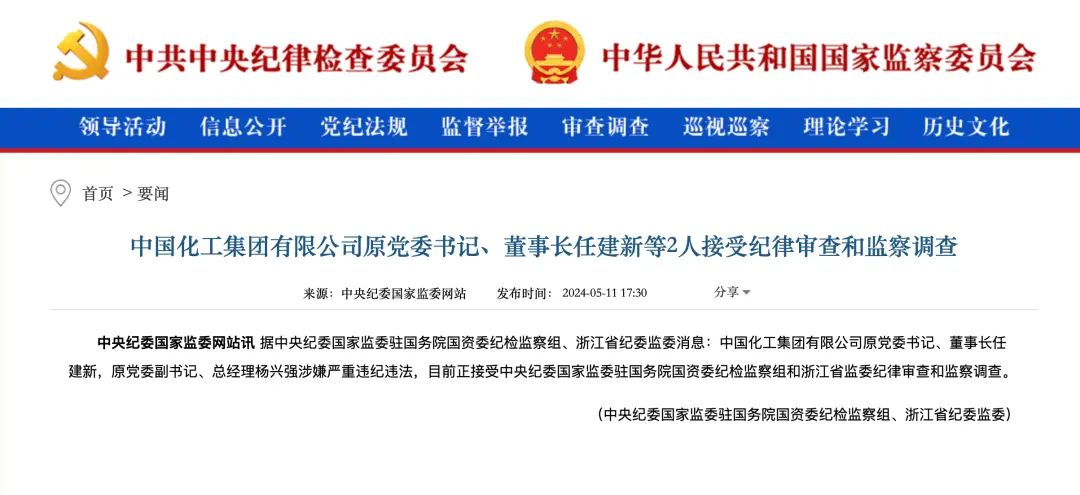 5月11日,据中央纪委国家监委驻国务院国资委纪检监察组、浙江省纪委监委消息:中国化工集团有限公司原党委书记、董事长任建新,原党委副书记、总经理杨兴强涉嫌严重违纪违法,目前正接受中央纪委国家监委驻国务院国资委纪检监察组和浙江省监委纪律审查和监察调查。