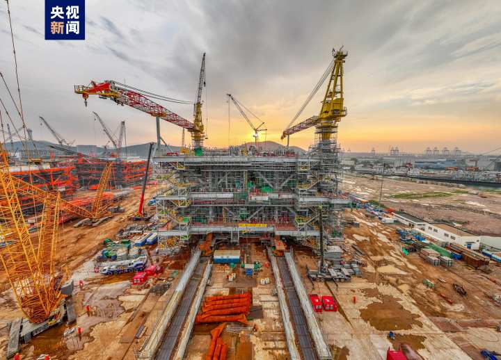 在山东青岛国际化高端装备制造基地,一个重达17000多吨“巨无霸”,是目前在建国际上最大的油气集输平台。经过34个月的施工建造,今天正式交付,月底将搭乘大型运输船,启程前往6400海里以外的海域进行安装。