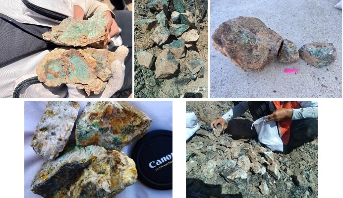 “新疆准噶尔东北缘成矿带北塔山-大红柳峡一带铜金钴战略性矿产调查评价”三级项目,由自然资源部“深部矿产资源探测与评价创新团队”矿产探测部王召林正高级工程师负责。通过工作,该项目在新疆东准噶尔一带矿业权空白区新发现铜金多金属矿点8处、铬铁矿点1处、赤(磁)铁矿点1处。其中1处铜(金)多金属矿带走向近东西向,初步控制矿带长约400米,宽约20米,带内见大量孔雀石、石英褐铁矿化及原生黄铜矿,快速分析仪显示新鲜面铜普遍大于5%(孔雀石化处铜大于70%),同时有金、铅、锌显示。另一处铜金多金属矿带走向280度,断续长近600米,宽10-20米不等,带内发现多处硅化铜铅矿体,主要为孔雀石、黄铜矿及方铅矿,目估铜品位大于5%。另外几处铜矿点经地表取样也发现块状富铜矿体,目估化学样品位铜大于5%。