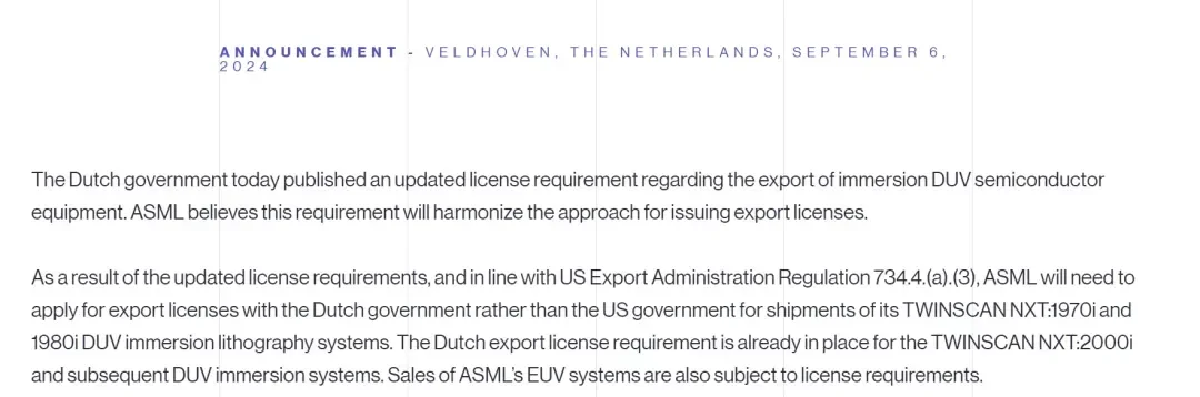 9月6日,光刻机巨头阿斯麦(ASML)在官网发表声明称,荷兰政府公布了浸润式DUV光刻机出口新规,自9月7日起生效。