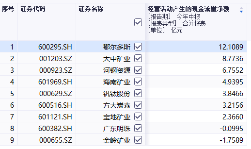 同花顺(134.240, 14.76, 12.35%)IFIND数据显示,根据申万行业分类,A股共有9家冶钢原料上市公司,大中矿业上半年经营活动产生的现金流量净额金额位列第二,仅次于鄂尔多斯(9.480, 0.43, 4.75%)。