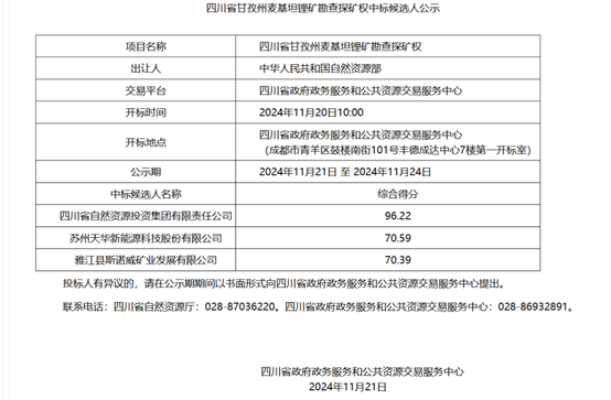 11月21日,四川省甘孜州麦基坦锂矿勘查探矿权中标候选人名单出炉,四川省自然资源投资集团有限责任公司(简称“四川省自然资源投资集团”)、苏州天华新能源科技股份有限公司(简称“天华新能”)、雅江县斯诺威矿业发展有限公司(简称“斯诺威”)三家企业入选。