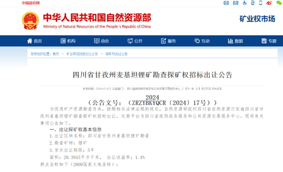 早在10月22日晚间,四川省公共资源交易平台就发布了《2024年四川省甘孜州麦基坦锂矿勘查探矿权招标出让公告》。