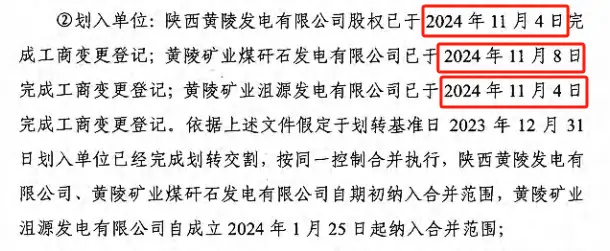 此外,陕煤集团将自身持有的黄陵矿业煤矸石发电有限公司52.94%股权,黄陵矿业集团有限责任公司持有的黄陵矿业煤矸石发电有限公司47.06%、陕西黄陵发电有限公司60%、黄陵矿业沮源发电有限公司100%的股权无偿划转至陕煤电力集团。