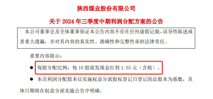 值得注意的是,就在收购公告同天,陕西煤业还发布了2024年三季度中期利润分配方案。