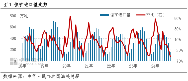 在全球镍市场中,“禁矿”消息并不少见,2020年前后印尼地区开启“禁矿”计划,直到2022年“禁矿”全面实施,海外冶炼企业不得不走出去,在印尼当地开疆拓土继续生存。印尼镍矿不再流出之后,菲律宾作为二梯队供应国开始出现在大众视野。如图1所示,印尼禁矿前后,镍矿进口量有明显减少趋势,其中2024年全年镍矿进口仅有3793.92万吨,较2019年全年(印尼禁矿政策实施前)减少1817.70万吨,减少幅度高达32.39%。因此卓创资讯认为,印尼地区镍冶炼逐步完善,国内铁厂开工不足,镍矿需求本身就有明显下滑趋势,因此菲律宾镍矿后续需求会有减少可能,“禁矿”影响正在逐步缩小。