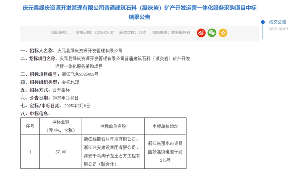 2月7日,浙江省丽水市533万吨/年砂石矿开发运营一体化服务采购项目公布中标结果。由浙江绿能石材开发有限公司、浙江兴安建设集团有限公司、淳安千岛湖子龙土石方工程有限公司3家民营企业组成的联合体成功中标该项目,中标金额为37元/吨,服务期限为5年(8个月内完成矿山前期建设及设备安装调试实现开机试生产)。