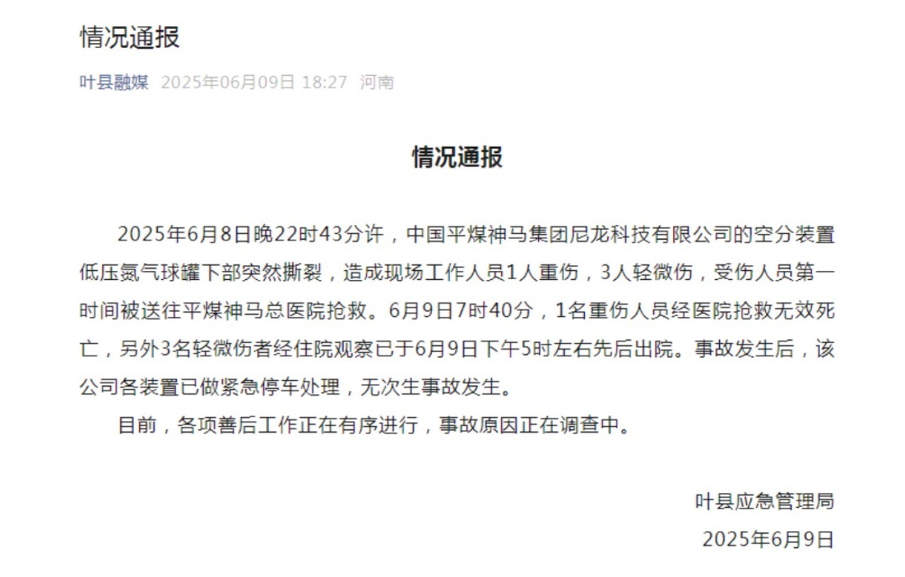 据河南省平顶山市叶县应急管理局消息,6月8日22时43分许,中国平煤神马集团尼龙科技有限公司的空分装置低压氮气球罐下部突然撕裂,造成1人死亡3人受伤。