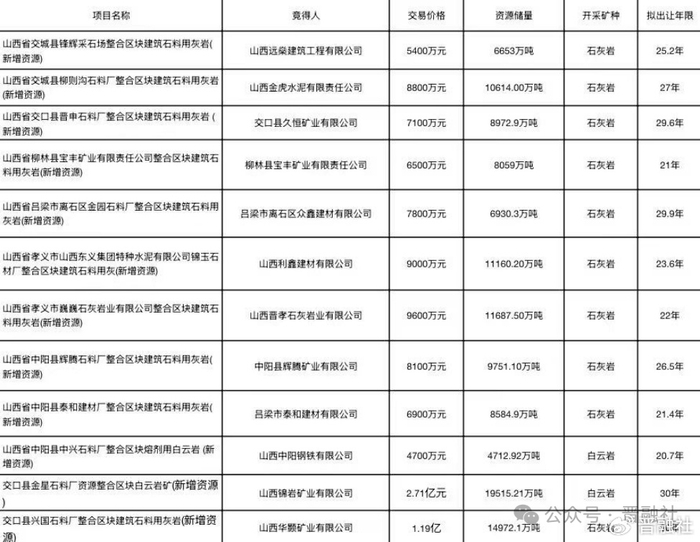 据悉,此次出让的矿权覆盖吕梁市交口县(4宗)、中阳县(3宗)、孝义县(2宗)、离石区、柳林县、交城县各1宗等6个县区,涉及建筑石料用灰岩、冶镁用白云岩等品类。