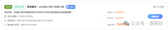 据公开信息,2025年7月3日,中阳钢铁拿下了中阳县山西中阳钢铁有限公司石料分公司石灰岩矿整合区块(新增资源)。该矿面积0.7225平方公里,开采矿种是建筑石料用灰岩,出让资源储量为20483.3万吨,起拍价15500万元。
