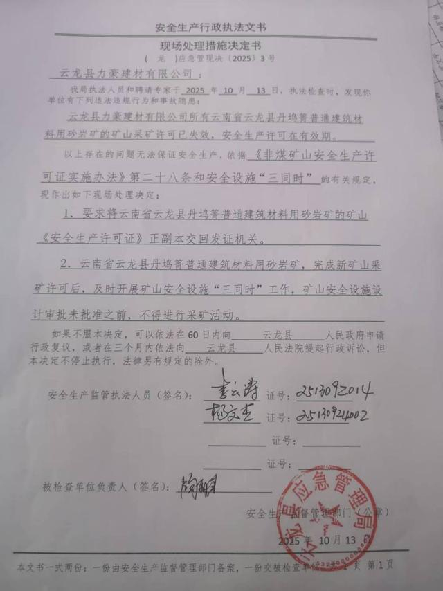 一份由云龙县应急管理局作出的安全生产行政执法文书显示,该局执法人员和聘请专家于2025年10月13日开展执法检查时,发现力豪建材公司所有丹坞箐普通建筑材料用砂岩矿的矿山采矿许可已失效,安全生产许可在有效期。要求其将丹坞箐普通建筑材料用砂岩矿的矿山《安全生产许可证》正副本交回发证机关。矿山安全设施设计审批未批准之前,不得进行采矿活动。
