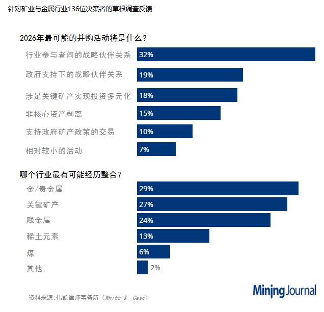 与此同时,调查受访者预计,黄金和贵金属将是明年最有可能进行整合的行业,其次是关键矿产。