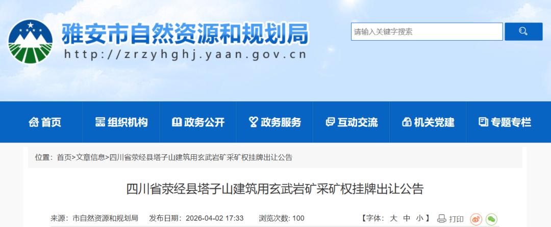 近日,受四川雅安市自然资源和规划局委托,雅安市政务服务和公共资源交易服务中心发布公告,将对四川省荥经县塔子山建筑用玄武岩矿采矿权实施挂牌出让。本次出让起始价为4.8亿元人民币,挂牌时间为2026年5月8日至5月21日。
