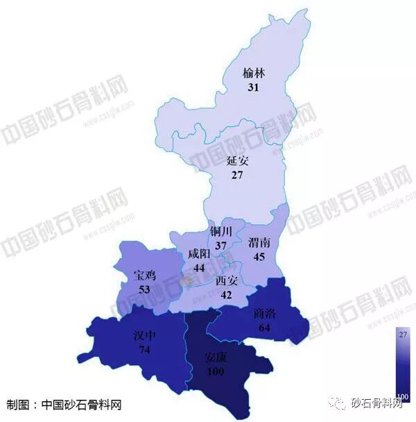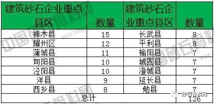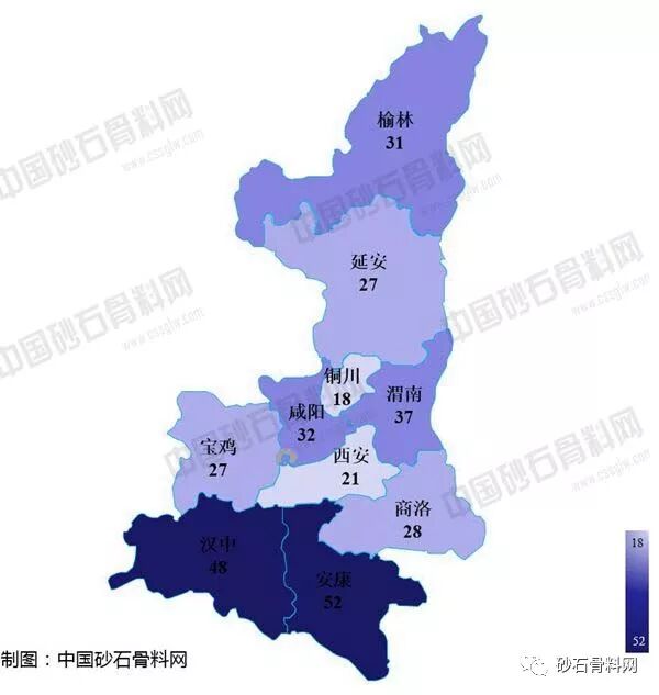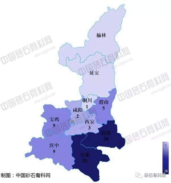 统计显示,陕西省建筑砂石企业重点分布区域为安康市、汉中市、渭南市、咸阳市、榆林市和铜川市。其中,安康市的重点区域为旬阳县和平利县;汉中市的重点区域为洋县、西乡县和城固县;渭南市则在蒲城县和澄城县比较集中;咸阳市有泾阳县和长武县;榆林市有神木县、榆阳区和府谷县;铜川市耀州区的砂石企业较多。