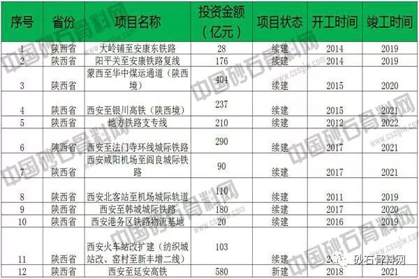 本次调研中统计的2018年陕西省主要在建和续建铁路项目共12个,里程总数约2428公里。据估算,这些项目需要砂石量约29136万吨。