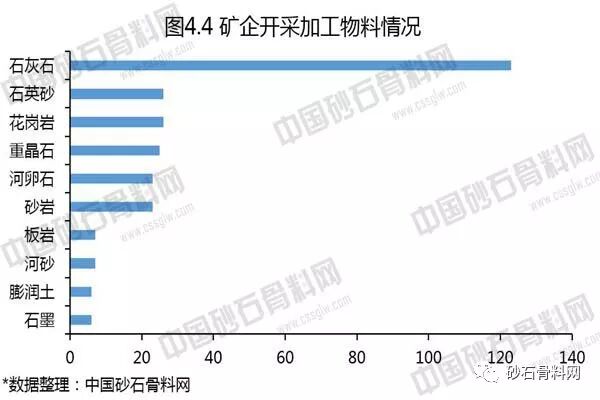据了解,陕西省矿企开采加工物料类型最多的是石灰石,其次是花岗岩、石英砂、重晶石等,金属矿产主要有金矿、铁矿、铅锌矿,钒矿等,与陕西省矿产资源情况基本一致。当地的碎石加工厂主要石灰石为原料,少部砂石企业破碎加工石英砂和河卵石;花岗岩主要用于石板材加工;陕西省矿企经营的主要物料类型及对应的企业数量如下图: