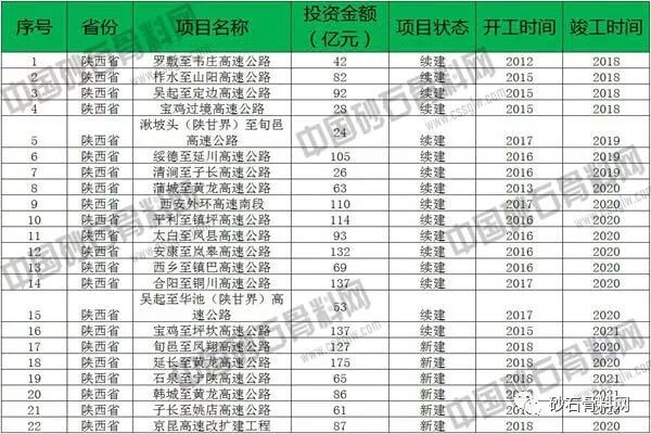 本次调研中统计的2018年陕西省主要在建和续建高速公路项目共22个,里程总数约1682公里。据估算,这些项目需要砂石量约10092万吨。