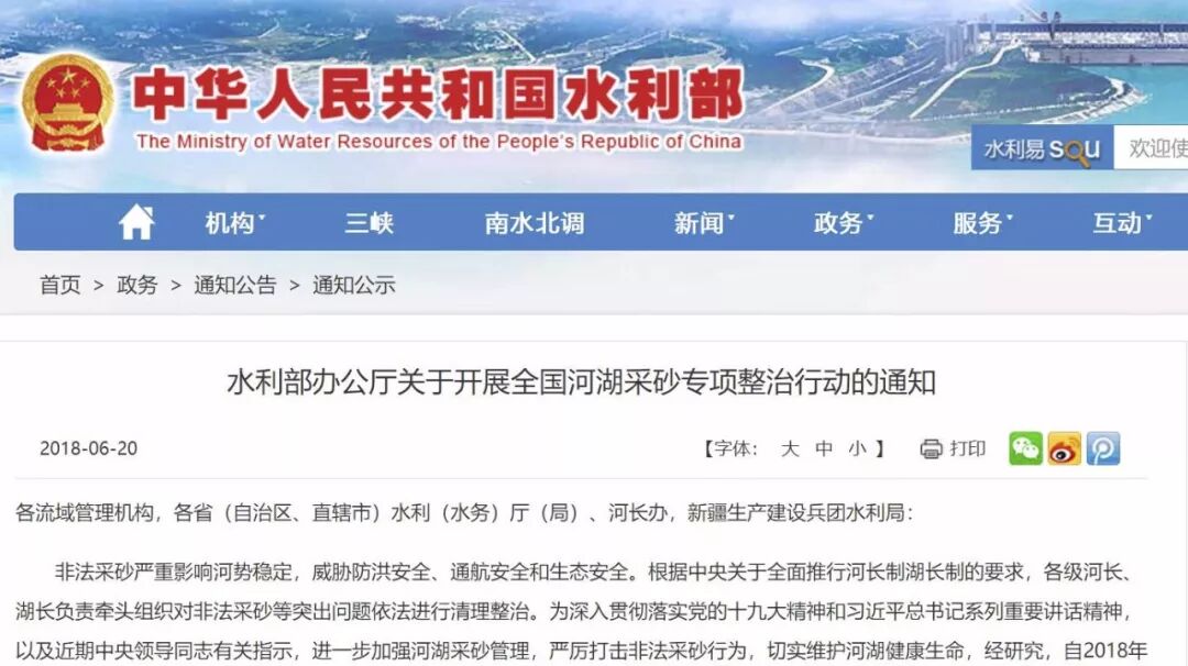 近日,为深入贯彻落实党的十九大精神和习近平总书记系列重要讲话精神,以及近期中央领导同志有关指示,进一步加强河湖采砂管理,严厉打击非法采砂行为,切实维护河湖健康生命。水利部发布《关于开展全国河湖采砂专项整治行动的通知》,通知要求:自2018年6月20日起,水利部在全国范围内组织开展为期6个月的河湖采砂专项整治行动(行动方案见文末附件)。