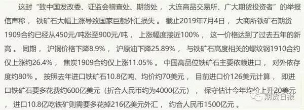 这封写给“大连商品交易所,中国证监会期货部”的举报信称,据现货商和钢厂反映,铁矿连续暴涨是国内外勾结的结果 。多头持仓第一的永安席位的头寸是三大矿山的股东的外资户。利用大商所铁矿石合约国际化的漏洞,通过国内机构配合叠加国外消息哄抬矿石价格,疯狂赚取中国钢厂利润。因为钢材起到国民经济和物价稳定的作用,所以不能随意暴涨,只能被动被矿山吃利润……“为保住国家供给侧改革胜利成果,本人冒死举报,不成功便成仁!”举报信中这样写道。