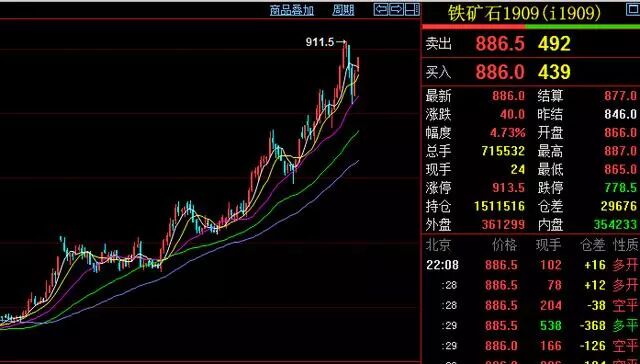 但是,昨日(周一)晚间,大商所铁矿石期货主力合约I1909再度大涨近5%。截至发稿,盘中最高至889元,已收复上周后半段的大部分跌幅。