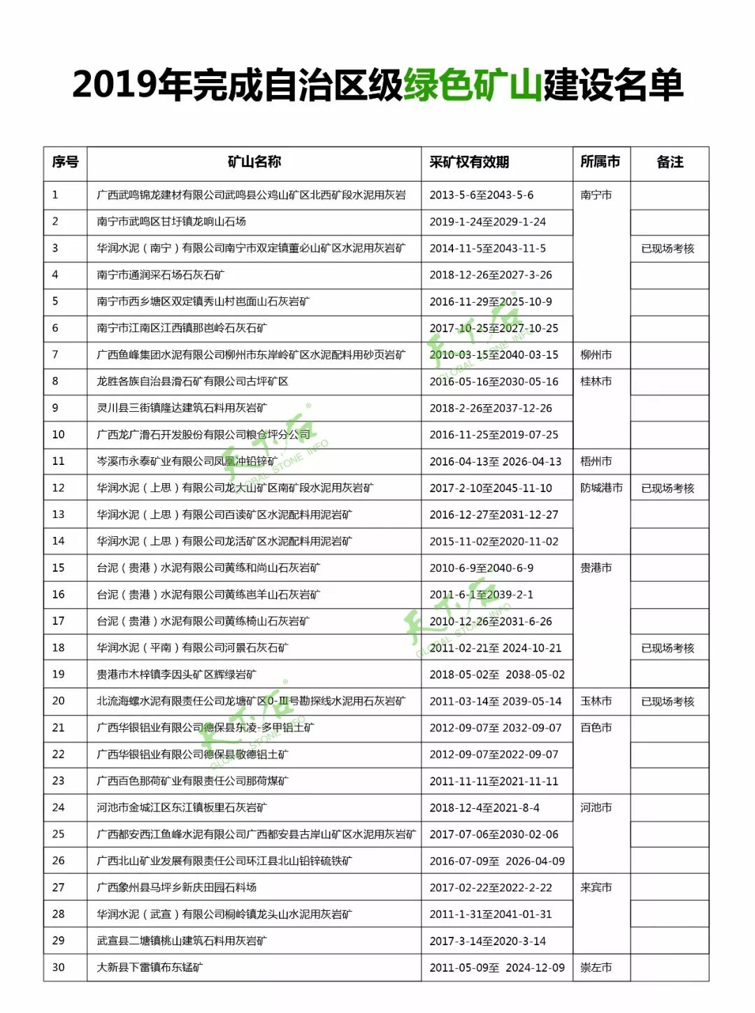 广西自治区2019年绿色矿山建设名单
