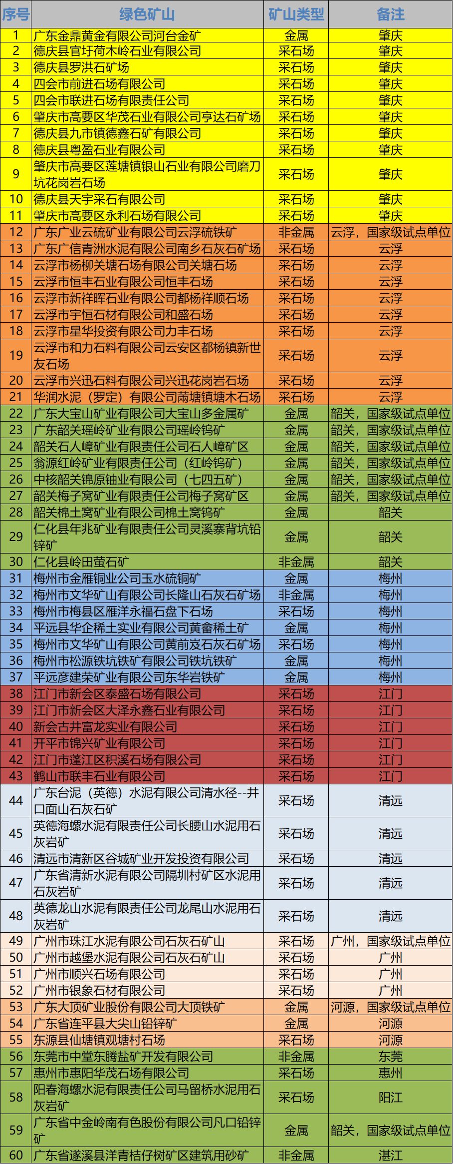 广东省2019年度绿色矿山遴选入库推荐名单