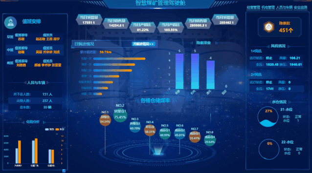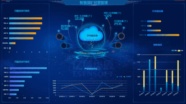 以煤炭产销管理为核心,实现资源开采全过程中资源量、开发速度、产量以及销售情况的精细化管理是矿业企业日常管理的主要内容。该张经营管理大屏,囊括矿山经营管理的重要数据,矿山产销情况一手掌握,为经营决策提供数据支撑。