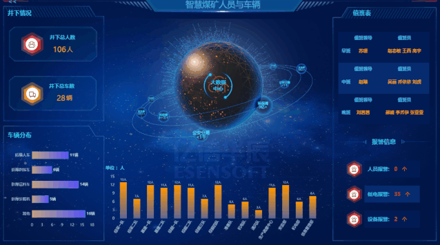 在矿井出入口部署人流及车辆统计系统,对每天进出矿井的人员进行记录,一旦发现进出人员不一致或者车辆设备有问题,即可及时展开报警、清点、核查、救援;同时值班表、报警信息等随屏展示,便于管控。
