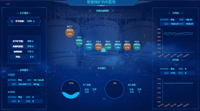 矿山开采情况复杂性,使用的机电设备种类、数量繁多,如果进行及时的维护与管理,一旦生产工作超出了设备的承载力,那么设备将无法正常投入生产,进而影响矿山开采进度与质量,甚至还有可能引发严重的安全事故,造成经济与人员方面的巨大损失。该张大屏,实时显示矿山设备、水仓液位、风机状况关键数据,异常情况随时掌握。