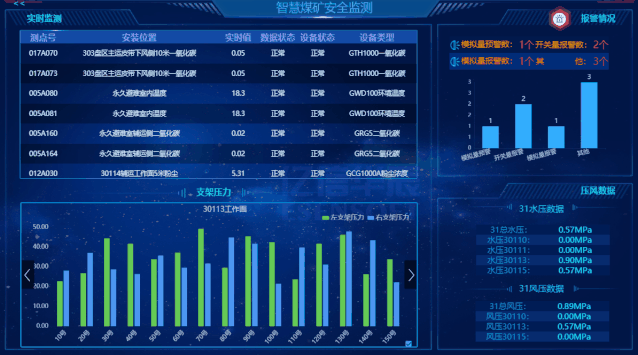 根据生产作业计划、井下空气质量监测数据,动态进行风网解算,实现按需通风,降本增效。同时,接入并整合井下环境量(如支架压力、水压 风压等)数据,实现煤矿全景数据的管理及呈现,并对异常环境量进行报警。