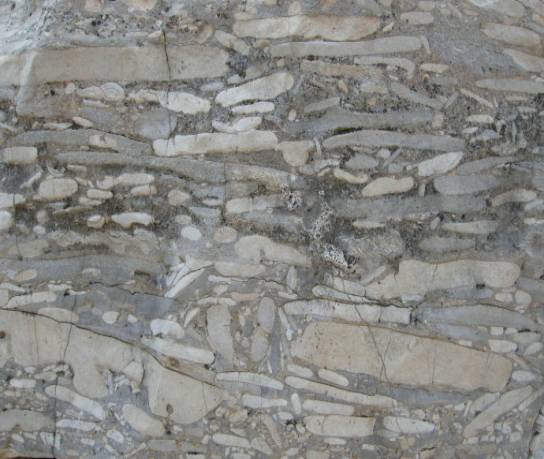 我本是海底的石灰泥,由于海水的退出,我露出水面被晒干固结成不规则的干泥块,之后发生的风暴大潮把我席卷起来,并随着潮水重新推入海底,在海底滚来滚去,不规则的碎块很快就变成一个个长条状的石灰泥砾石,风暴潮过后,长条状的泥砾在此堆积在一起,经过成岩作用,我就成了今天这个样子。由于我是远古风暴的产物,地质学家同时又称我为“风暴岩”。我非常想通过地质学家这个翻译,和人类成为朋友,更希望大家能够认识我、了解我、喜欢我、爱护我。
