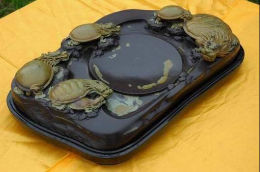 科学解说:角岩是一类由泥质岩(以黏土矿物为主的页岩之类)在侵入体附近发生接触变质作用而产生的变质岩。颜色较泥灰岩更深,呈深暗或灰色;硬度比泥灰岩显著增加;质地较泥灰岩更加均匀。故产地多有将角岩制成砚台或其他工艺品的做法。在苏州灵岩山、寒山寺等旅游区出售的砚台,即是利用产于灵岩山花岗岩体附近的角岩所制。