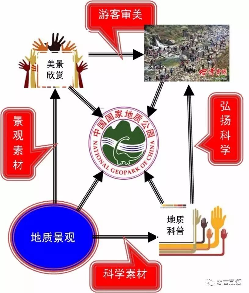 地质公园是我国目前最为骄傲的“自然科普大课堂”。它赋予了地质旅游两个“抓手”,一个抓手是“美学欣赏”,另一个“抓手”是地学科普。尤其是地学科普形式多种多样,制作影视、出版专刊、编写图书、免费折页、组织活动、开展讲座、编写教材、组织实习等等,满足了游客不同的心理需求。使地质旅游活动更加具有现实意义。