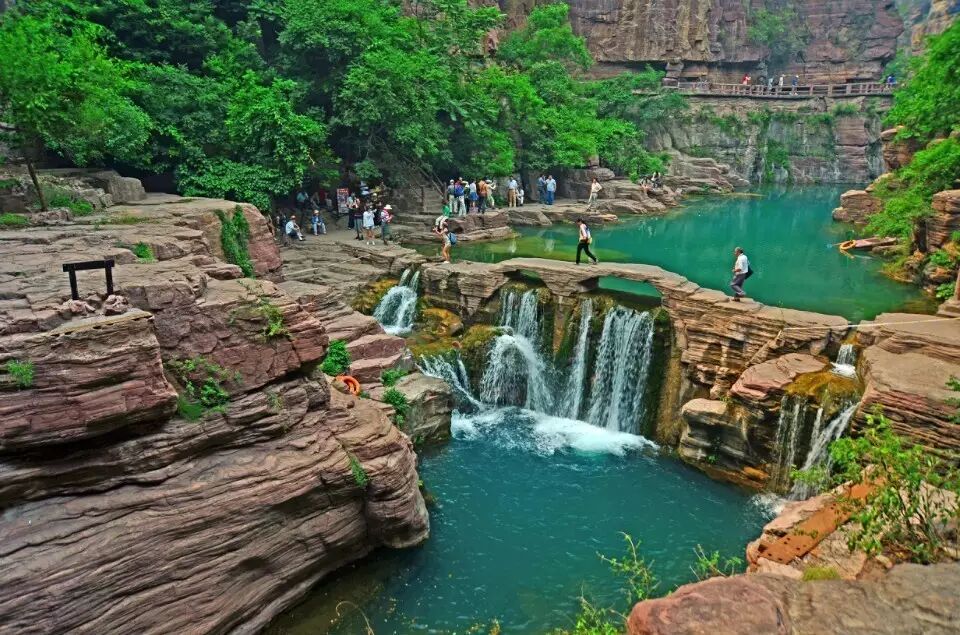 红石峡(温盘峪)峡内青苔绿草,四季如春。崖壁上的凹凸石,纹理清晰,组合奇妙,有如浮雕造型;散布在谷底的崩塌巨石形态各异,有的如金龟浮水,有的如石岛庭院;瀑下崖壁上的青苔,有如绿色天鹅绒挂毡。河南省著名诗人王怀让有诗赞曰:“万斛珍珠落碧潭,四季共浴一温盘。白龙不知何处去,红衣小姐映笑脸”。在峡中游览有与世隔绝、超凡入仙之感,这方小巧玲珑之美组合被誉为“盆景式”峡谷中的精灵,实属少有。