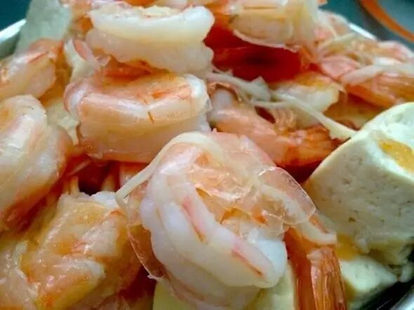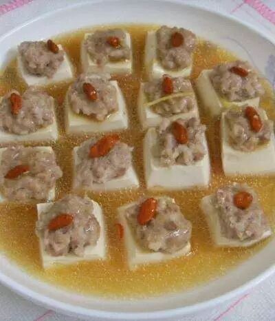 d 豆腐切成8块,放在碟子上。每一块中间用小勺子挖空。放入猪肉馅,然后在猪肉馅上如上鲜虾,摆好造型后,在每一块豆腐上加入枸杞;